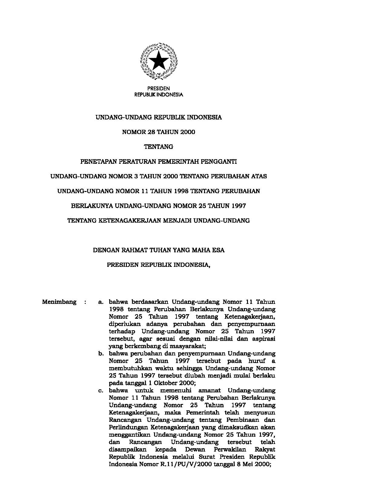 UNDANG-UNDANG REPUBLIK INDONESIA : NOMOR 28 TAHUN 2000 TENTANG KETENAGAKERJAAN MENJADI UNDANG-UNDAN....