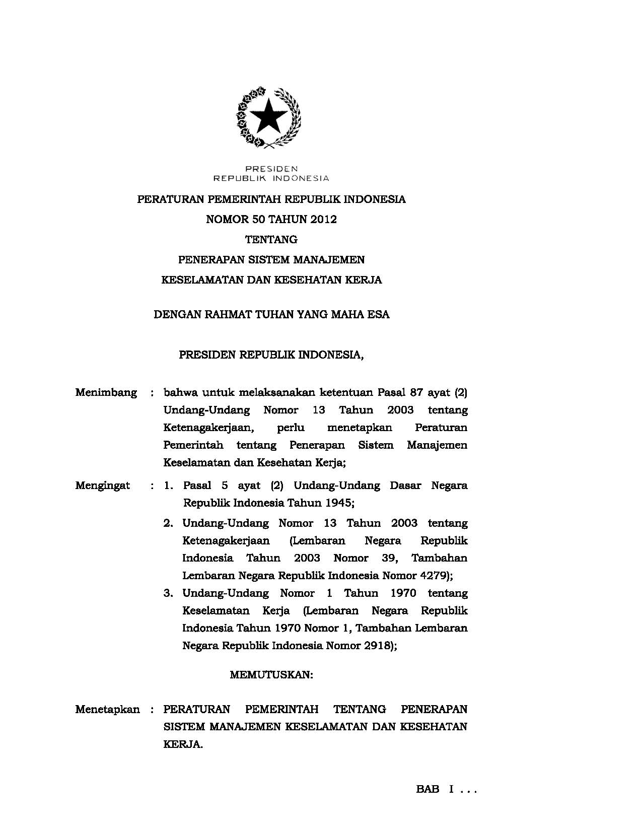 PERATURAN PEMERINTAH REPUBLIK INDONESIA : NOMOR 50 TAHUN 2012 TENTANG PENERAPAN SISTEM MANAJEMEN KE....