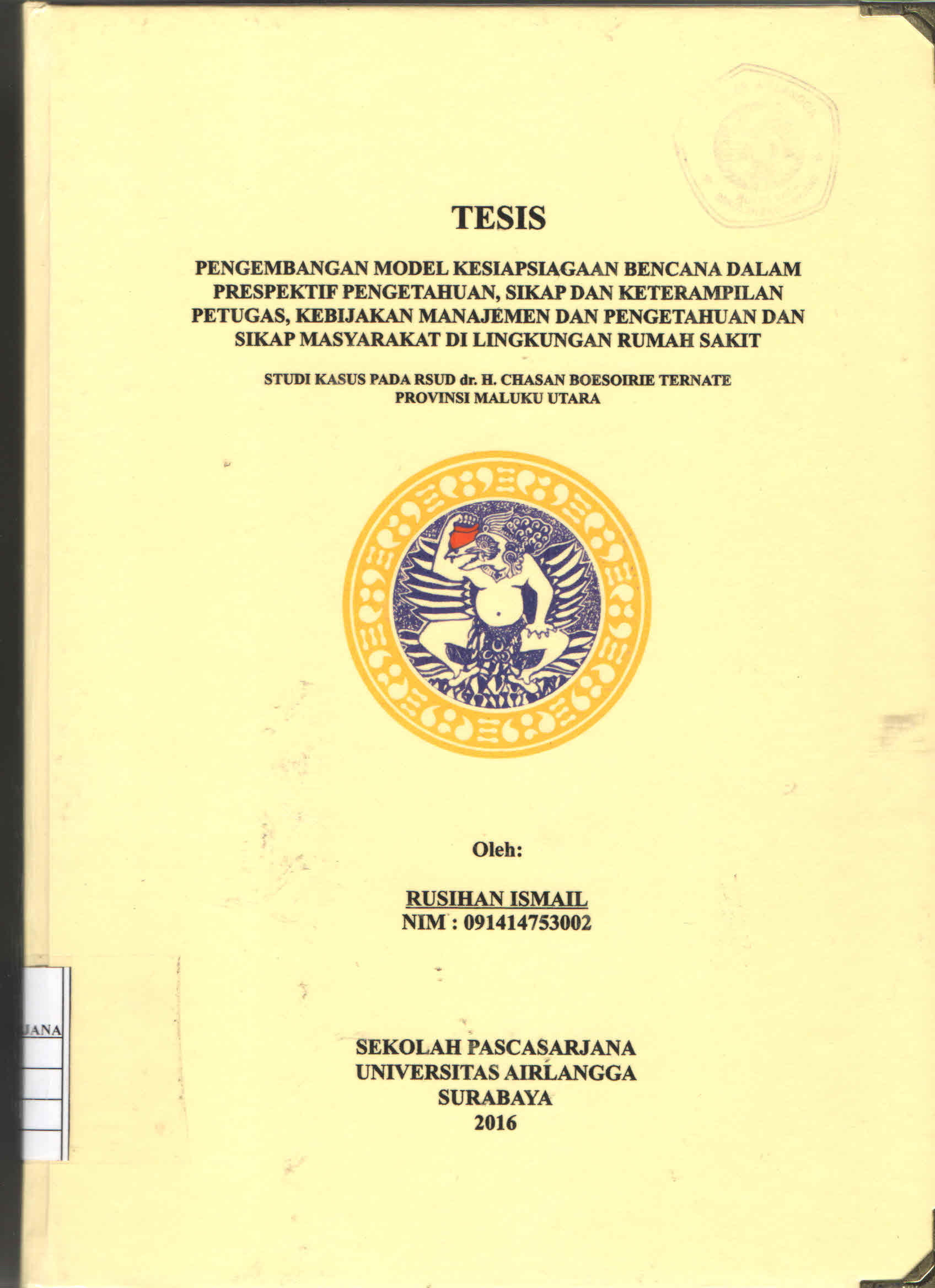 | Judul | Pengembangan Model Kesiapsiagaan Bencana dalam Perspektif Pengetahuan, Sikap, dan Keterampilan Petugas, Kebijakan Manajemen dan Pengetahuan dan Sikap Masyarakat di Lingkungan Rumah Sakit: Studi Kasus pada RSUD dr. H. Chasan Boesoirie Ternate Provinsi Maluku Utara / Rusihan Ismail |