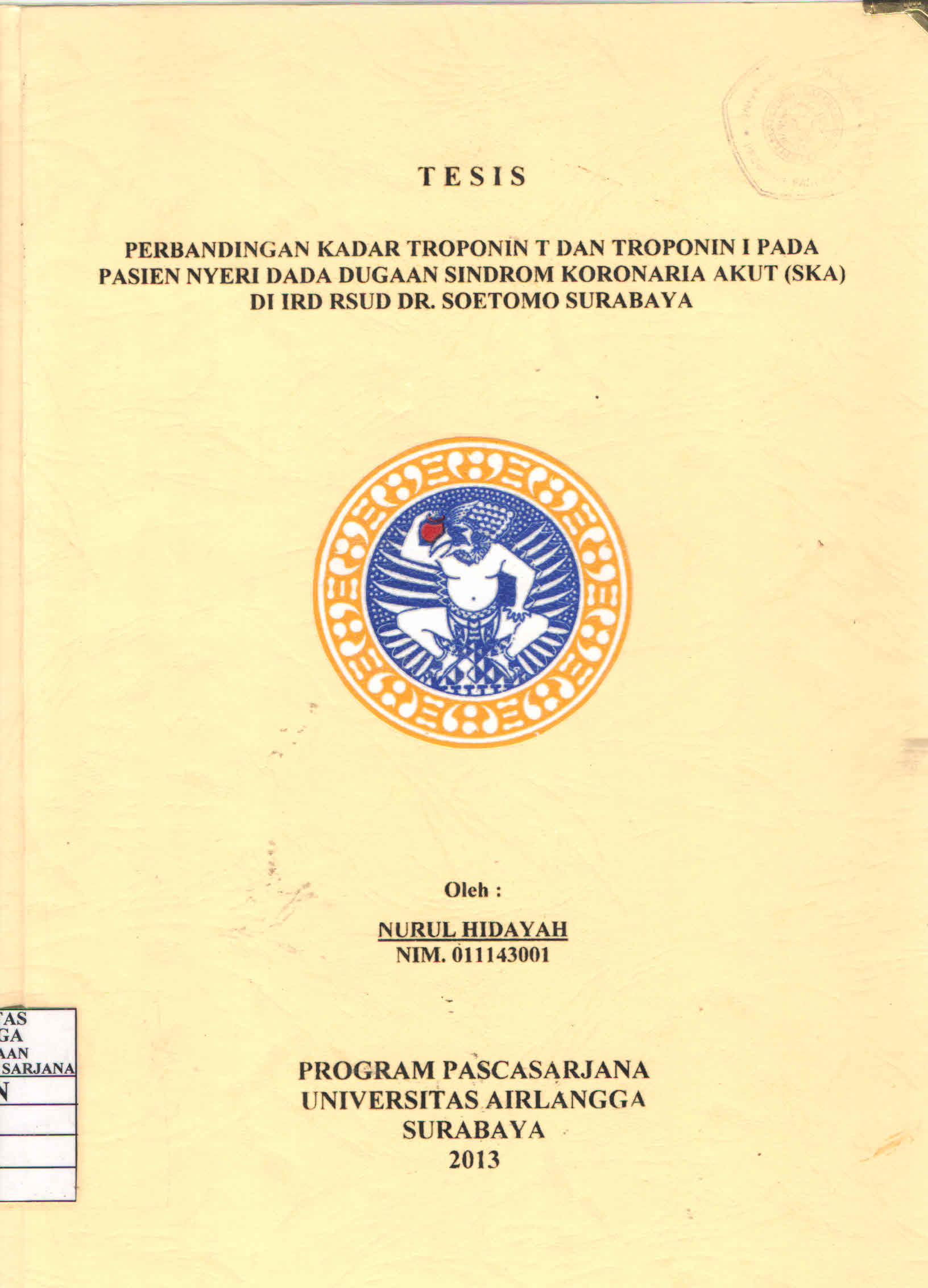 | Judul | Perbandingan Kadar Troponin T dan Troponin I pada Pasien Nyeri Dada Dugaan Sindrom Koronaria Akut (SKA) di IRD RSUD DR. Soetomo Surabaya / Nurul Hidayah |