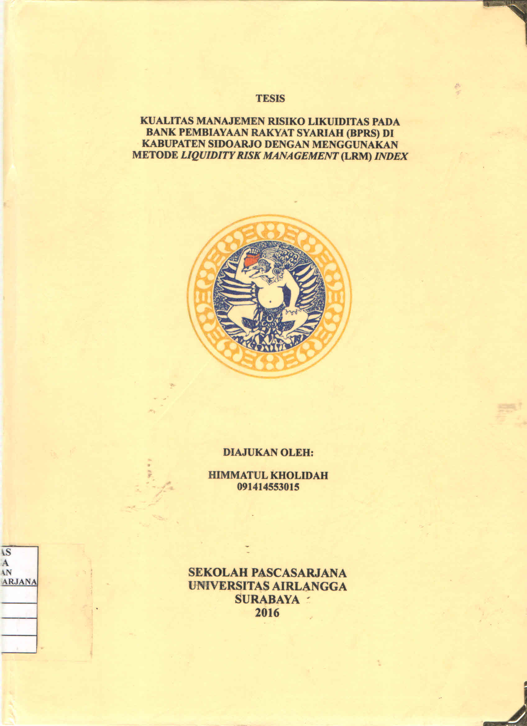 | Judul | Kualitas Manajemen Risiko Likuiditas pada Bank Pembiayaan Rakyat Syariah (BPRS) di Kabupaten Sidoarjo dengan Menggunakan Metode Liquidity Risk Management (LRM) Index / Himmatul Kholidah |