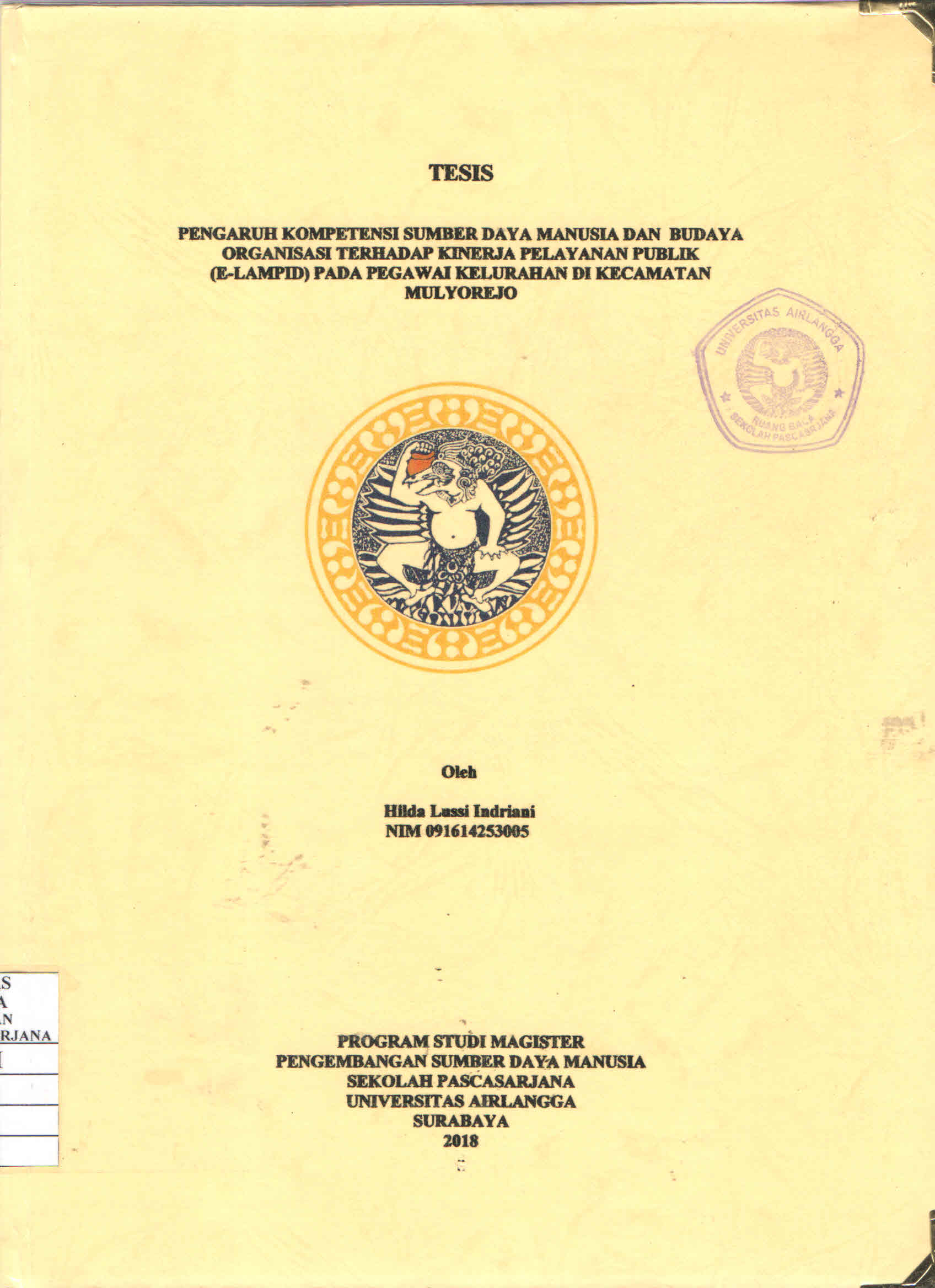 | Judul | Pengaruh Kompetensi Sumber Daya Manusia dan Budaya Organisasi Terhadap Kinerja Pelayanan Publik (E-LAMPID) pada Pegawai Kelurahan di Kecamatan Mulyorejo / Hilda Lussi Indriani |