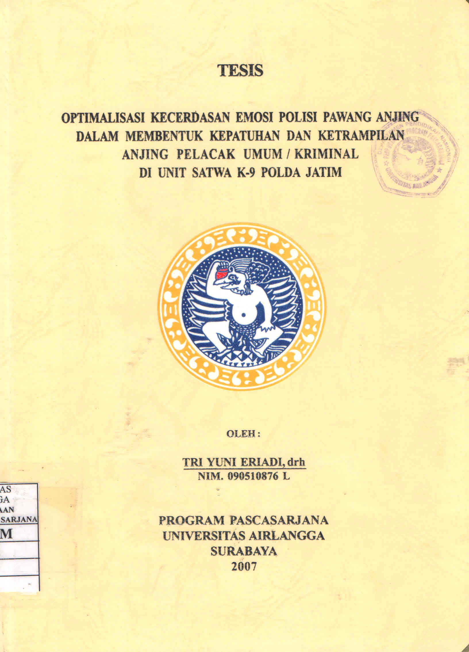 | Judul | Optimalisasi Kecerdasan Emosi Polisi Pawang Anjing dalam Membentuk Kepatuhan dan Ketrampilan Anjing Pelacak Umum / Kriminal di Unit Satwa K-9 Polda Jatim / Tri Yuni Eriadi |